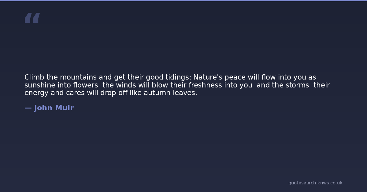 Climb the mountains and get their good tidings: Nature's peace will flow into you as sunshine into flowers the winds will blow their freshness into you and the storms their energy and cares will drop off like autumn leaves.