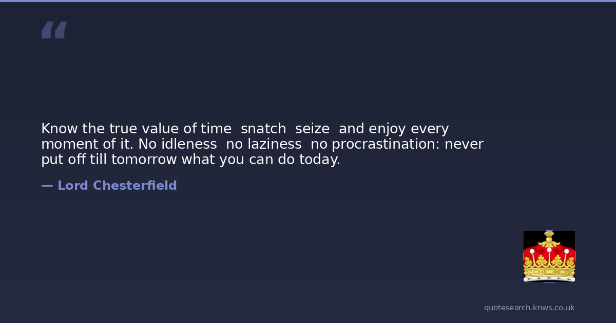 Know the true value of time snatch seize and enjoy every moment of it. No idleness no laziness no procrastination: never put off till tomorrow what you can do today.