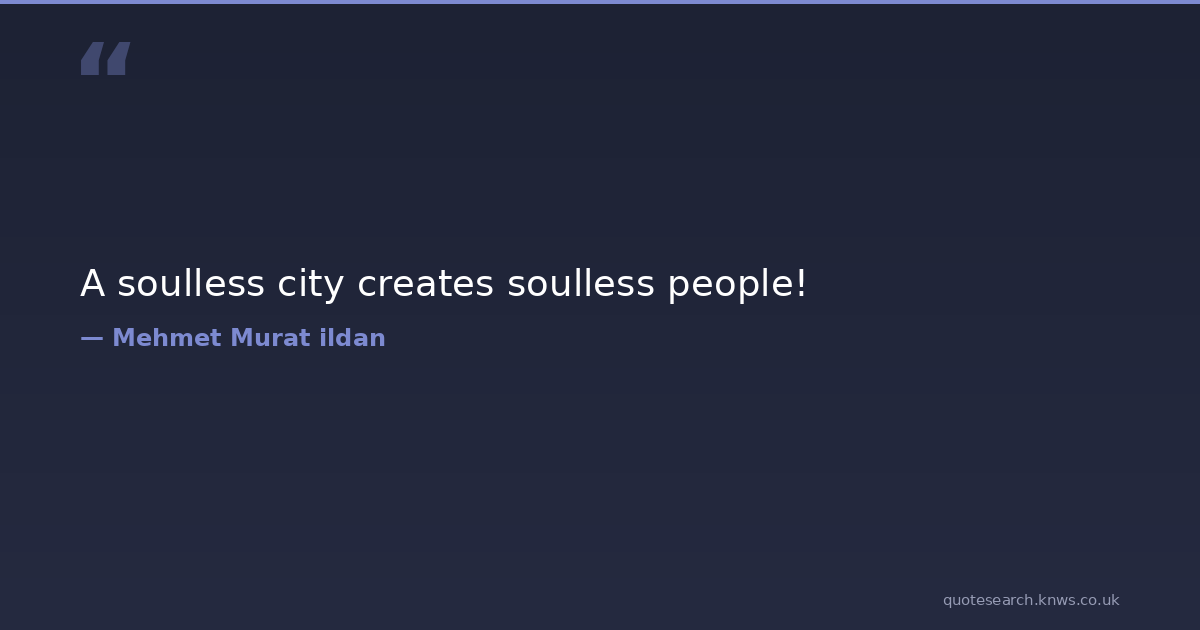 A soulless city creates soulless people! cities city city-quotes ildan-wisdom ildan-wise-sayings ildan-words mehmet-murat-ildan-quotations mehmet-murat-ildan-quotes people soulless turkish-authors turkish-literature turkish-playwrights turkish-quotations turkish-quotes turkish-wisdom-words turkish-writers Download Image Share on X Share on Facebook Copy Link