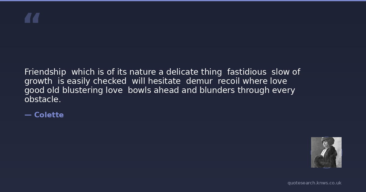 Friendship which is of its nature a delicate thing fastidious slow of growth is easily checked will hesitate demur recoil where love good old blustering love bowls ahead and blunders through every obstacle.