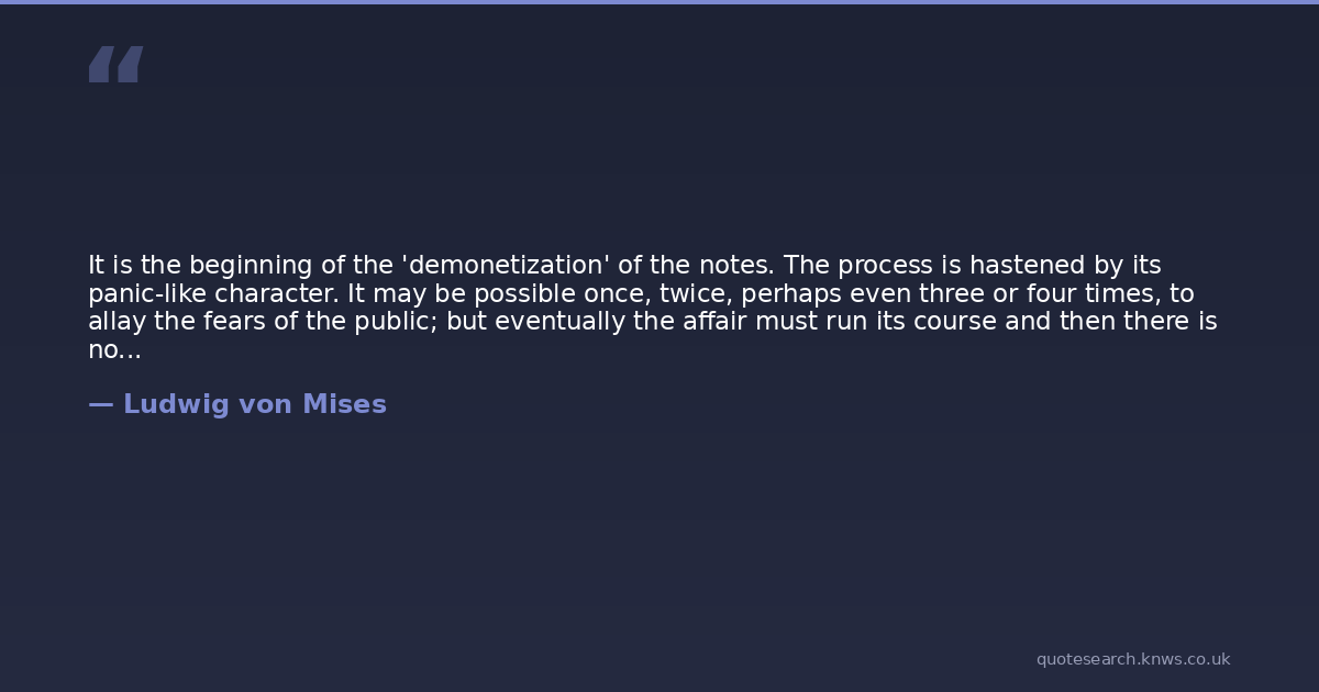 It is the beginning of the 'demonetization' of the notes. The process is hastened by its panic-like character. It may be possible once, twice, perhaps even three or four times, to allay the fears of the public; but eventually the affair must run its course and then there is no longer any going back. Once the depreciation is proceeding so rapidly that sellers have to reckon with considerable losses even if they buy again as quickly as is possible, then the position of the currency is hopeless.