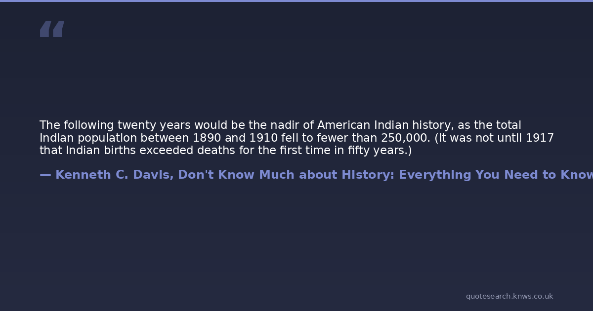 The following twenty years would be the nadir of American Indian history, as the total Indian population between 1890 and 1910 fell to fewer than 250,000. (It was not until 1917 that Indian births exceeded deaths for the first time in fifty years.)
