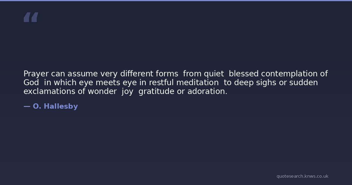 Prayer can assume very different forms from quiet blessed contemplation of God in which eye meets eye in restful meditation to deep sighs or sudden exclamations of wonder joy gratitude or adoration.