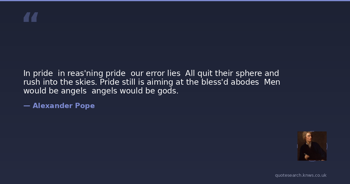 In pride in reas'ning pride our error lies All quit their sphere and rush into the skies. Pride still is aiming at the bless'd abodes Men would be angels angels would be gods.