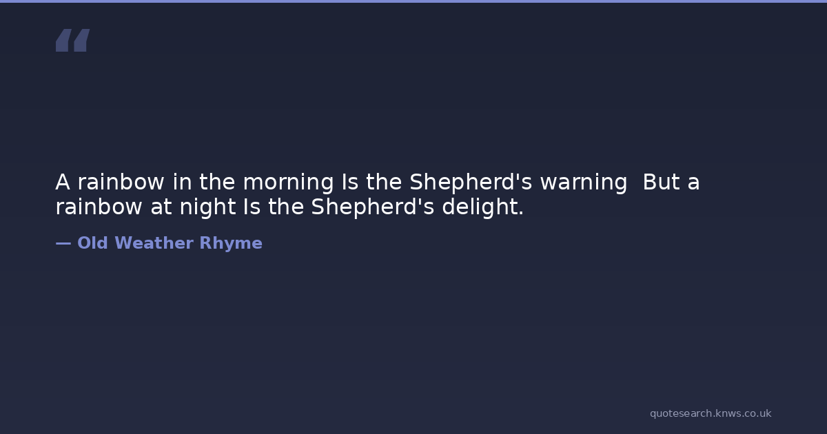 A rainbow in the morning Is the Shepherd's warning But a rainbow at night Is the Shepherd's delight. rainbow Download Image Share on X Share on Facebook Copy Link