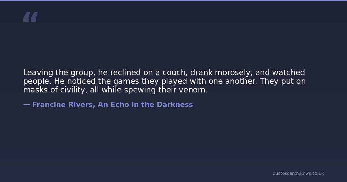 Leaving the group, he reclined on a couch, drank morosely, and watched people. He noticed the games they played with one another. They put on masks of civility, all while spewing their venom.