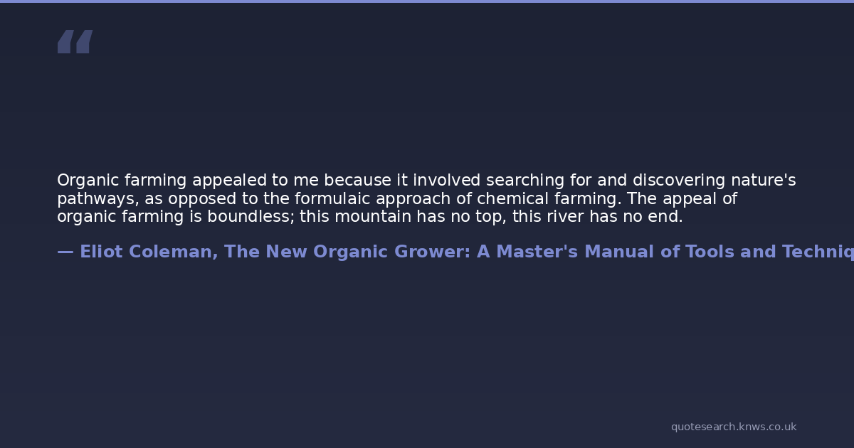 Organic farming appealed to me because it involved searching for and discovering nature's pathways, as opposed to the formulaic approach of chemical farming. The appeal of organic farming is boundless; this mountain has no top, this river has no end.