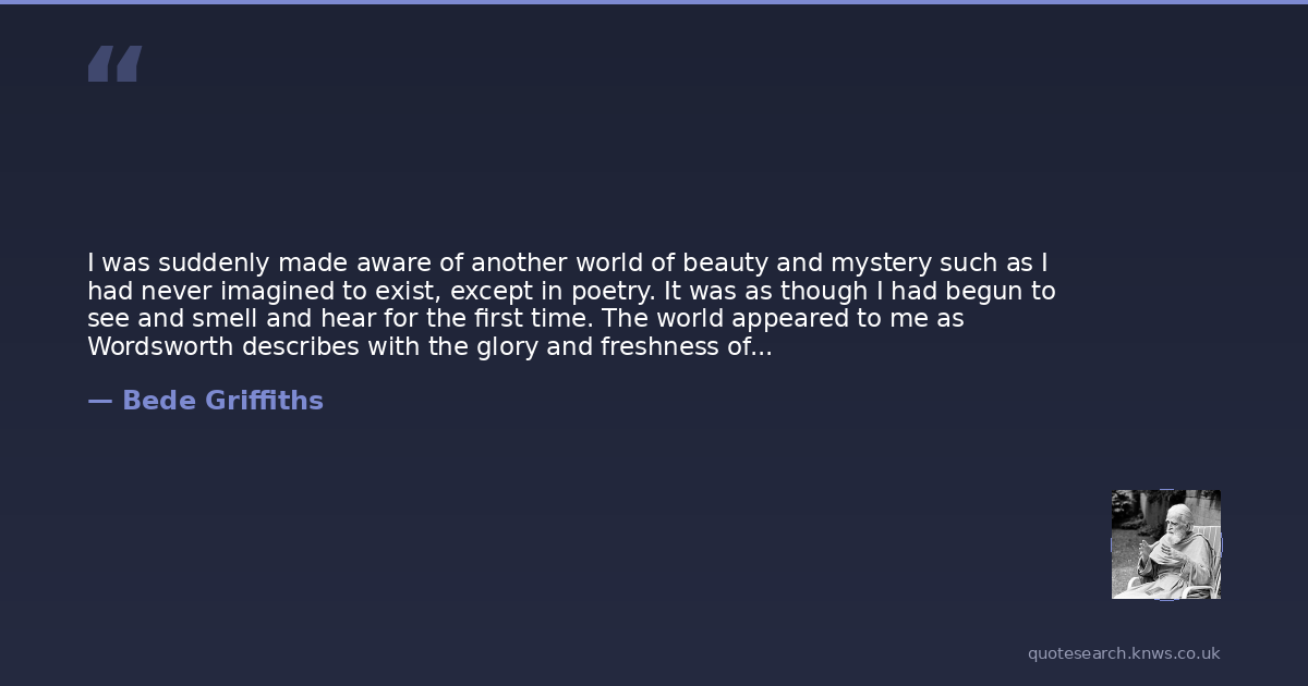 I was suddenly made aware of another world of beauty and mystery such as I had never imagined to exist, except in poetry. It was as though I had begun to see and smell and hear for the first time. The world appeared to me as Wordsworth describes with the glory and freshness of a dream. The sight of a wild rosegrowing on a hedge, the scent of lime-tree blossoms caught suddenly as I rode down a hill on a bicycle, came to me like visitations from another world. But it was not only my sensesthat were awakened. I experienced an overwhelming emotionin the presence of nature, especially at evening. It began to have a kind of sacramental character for me. I approached it with a sense of almost religious awe and , in a hush that comes before sunset, I felt again the presence of an almost unfathomable mystery. The song of the birds, the shape of the trees, the colors of the sunset, were so many signs of the presence, which seemed to be drawing me to itself.
