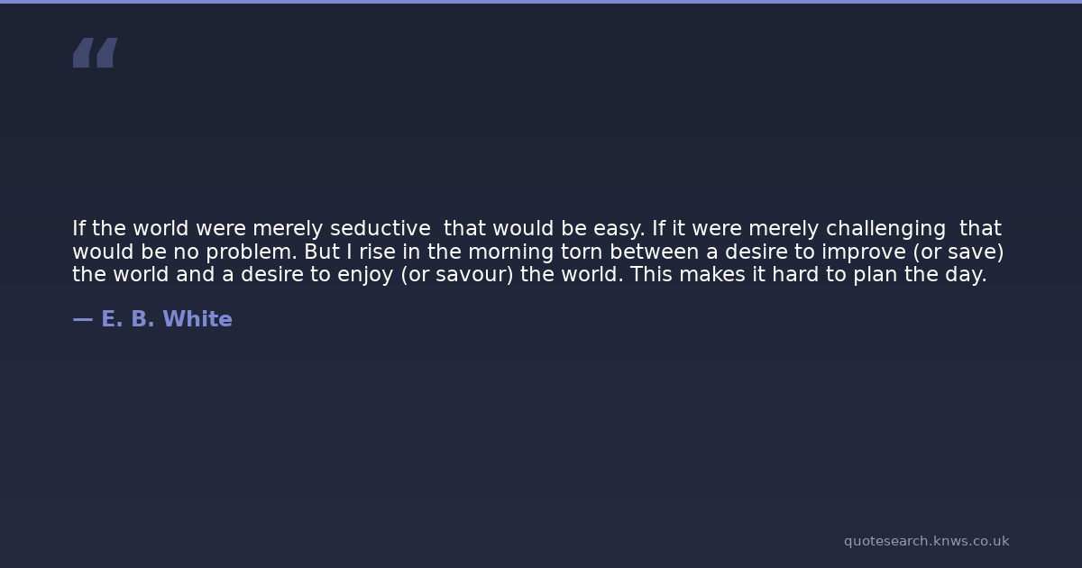 If the world were merely seductive that would be easy. If it were merely challenging that would be no problem. But I rise in the morning torn between a desire to improve (or save) the world and a desire to enjoy (or savour) the world. This makes it hard to plan the day.