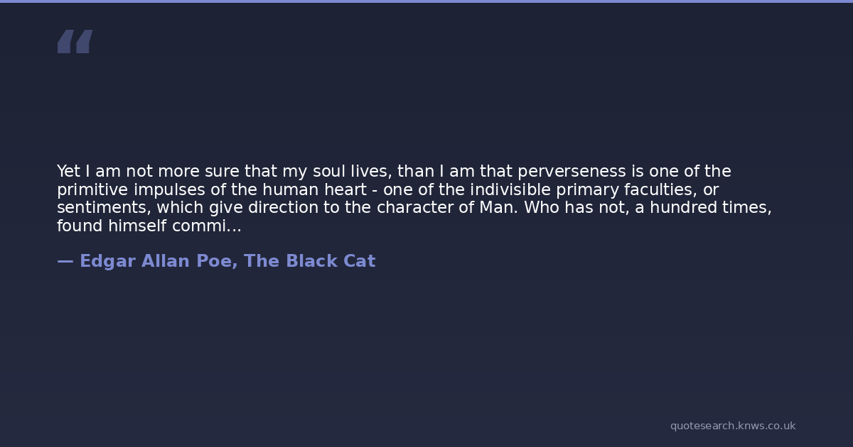Yet I am not more sure that my soul lives, than I am that perverseness is one of the primitive impulses of the human heart - one of the indivisible primary faculties, or sentiments, which give direction to the character of Man. Who has not, a hundred times, found himself committing a vile or a silly action, for no other reason than because he knows he should not? Have we not a perpetual inclination, in the teeth of our best judgment, to violate that which is Law, merely because we understand it to be such?