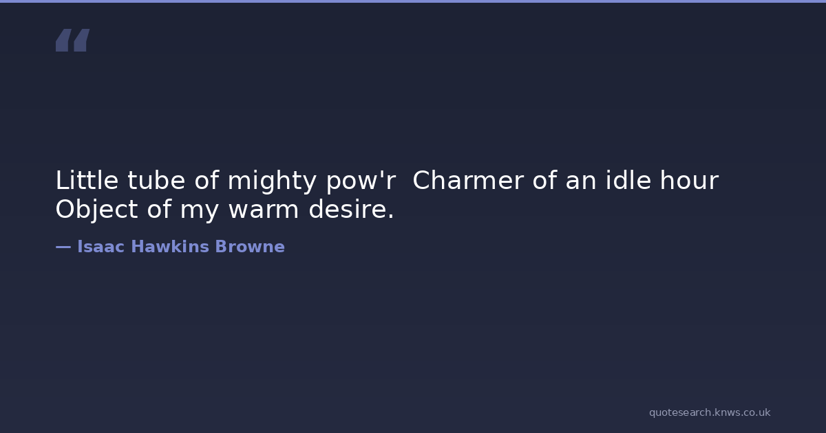 Little tube of mighty pow'r Charmer of an idle hour Object of my warm desire. tobacco Download Image Share on X Share on Facebook Copy Link