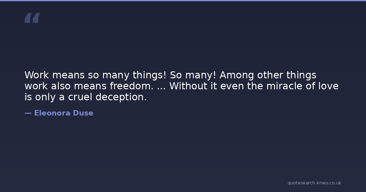 Work means so many things! So many! Among other things work also means freedom. ... Without it even the miracle of love is only a cruel deception.