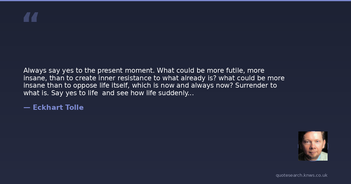 Always say yes to the present moment. What could be more futile, more insane, than to create inner resistance to what already is? what could be more insane than to oppose life itself, which is now and always now? Surrender to what is. Say yes to life and see how life suddenly starts working for you rather than against you.