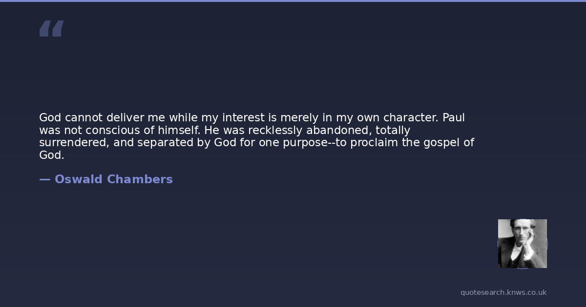 God cannot deliver me while my interest is merely in my own character. Paul was not conscious of himself. He was recklessly abandoned, totally surrendered, and separated by God for one purpose--to proclaim the gospel of God.