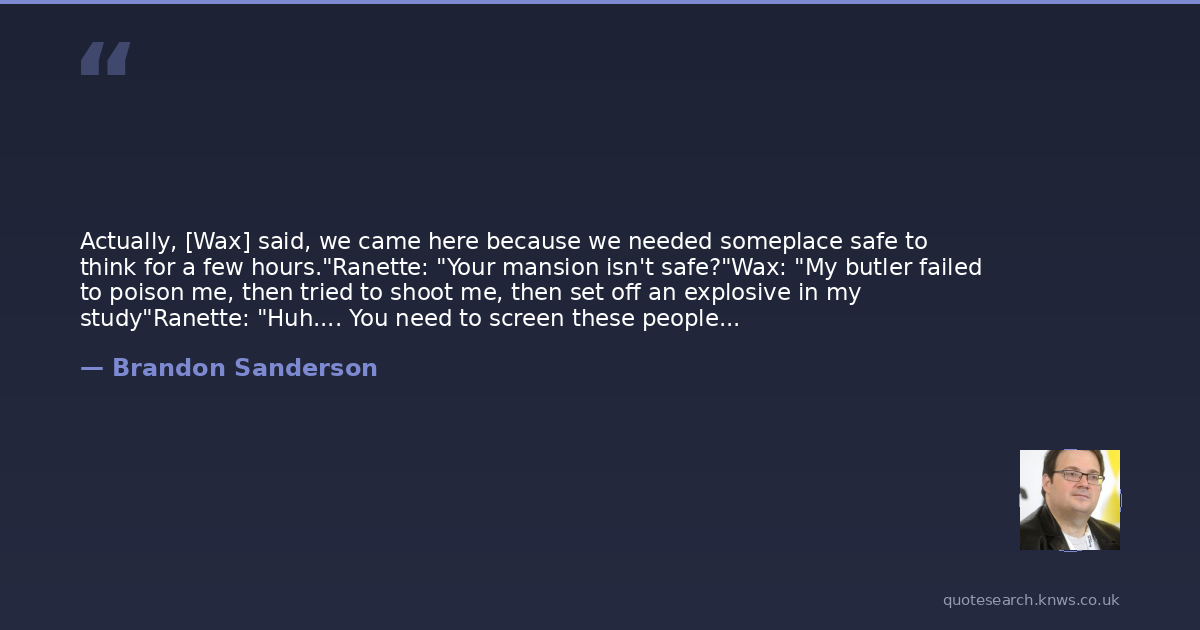 Actually, [Wax] said, we came here because we needed someplace safe to think for a few hours."Ranette: "Your mansion isn't safe?"Wax: "My butler failed to poison me, then tried to shoot me, then set off an explosive in my study"Ranette: "Huh.... You need to screen these people better, Wax.
