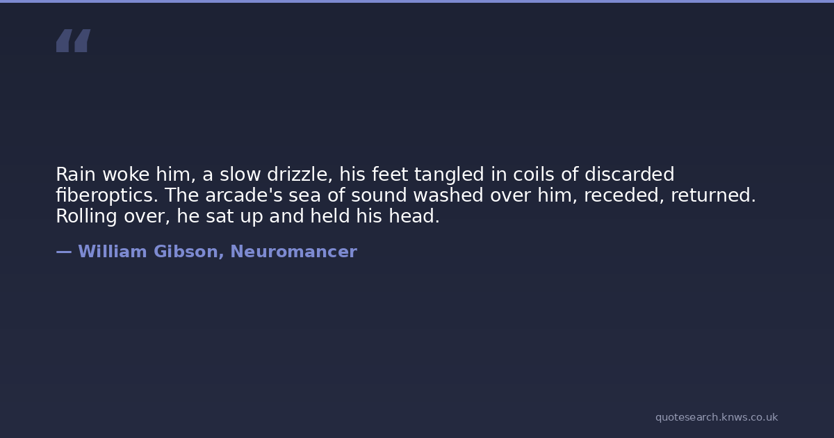 Rain woke him, a slow drizzle, his feet tangled in coils of discarded fiberoptics. The arcade's sea of sound washed over him, receded, returned. Rolling over, he sat up and held his head.