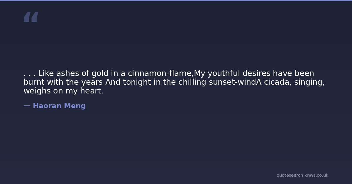 . . . Like ashes of gold in a cinnamon-flame,My youthful desires have been burnt with the years And tonight in the chilling sunset-windA cicada, singing, weighs on my heart.