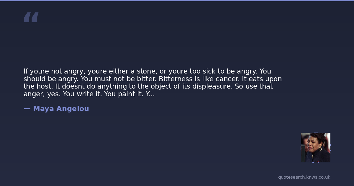 If youre not angry, youre either a stone, or youre too sick to be angry. You should be angry. You must not be bitter. Bitterness is like cancer. It eats upon the host. It doesnt do anything to the object of its displeasure. So use that anger, yes. You write it. You paint it. You dance it. You march it. You vote it. You do everything about it. You talk it. Never stop talking it.
