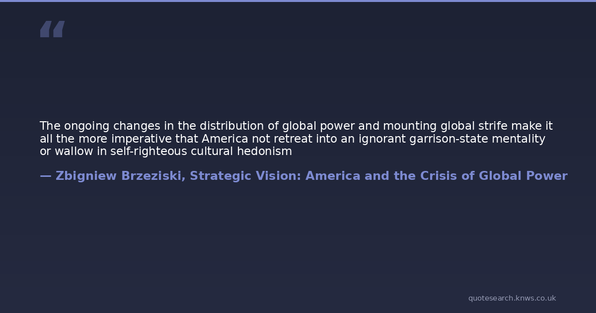 The ongoing changes in the distribution of global power and mounting global strife make it all the more imperative that America not retreat into an ignorant garrison-state mentality or wallow in self-righteous cultural hedonism