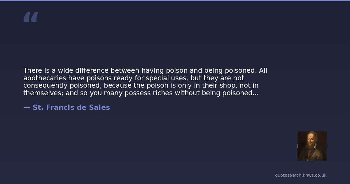 There is a wide difference between having poison and being poisoned. All apothecaries have poisons ready for special uses, but they are not consequently poisoned, because the poison is only in their shop, not in themselves; and so you many possess riches without being poisoned by them, so long as they are in your house or purse only, and not in your heart. It is the Christian's privilege to be rich in material things , and poor in attachment to them.