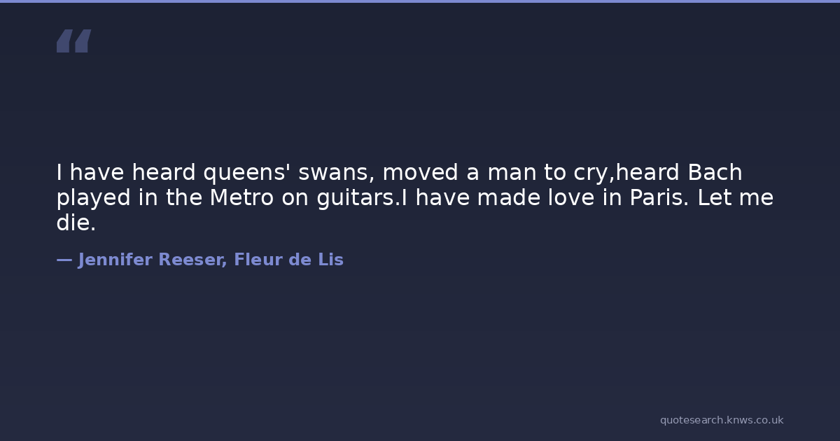 I have heard queens' swans, moved a man to cry,heard Bach played in the Metro on guitars.I have made love in Paris. Let me die.