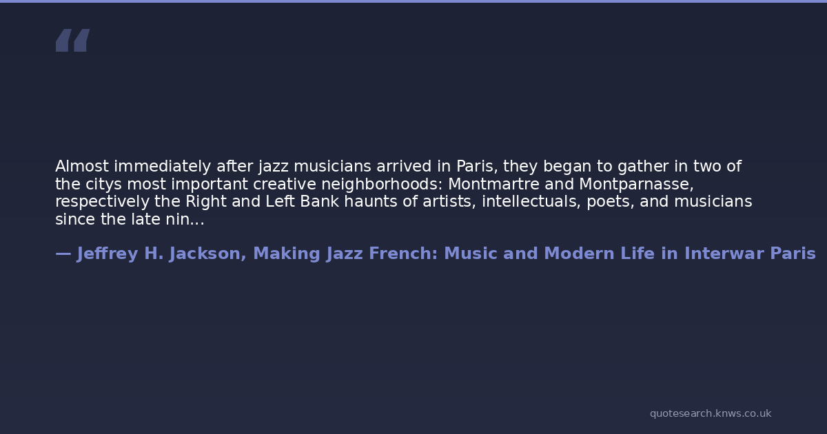 Almost immediately after jazz musicians arrived in Paris, they began to gather in two of the citys most important creative neighborhoods: Montmartre and Montparnasse, respectively the Right and Left Bank haunts of artists, intellectuals, poets, and musicians since the late nineteenth century. Performing in these high-profile and popular entertainment districts could give an advantage to jazz musicians because Parisians and tourists already knew to go there when they wanted to spend a night out on the town. As hubs of artistic imagination and experimentation, Montmartre and Montparnasse therefore attracted the kinds of audiences that might appreciate the new and thrilling sounds of jazz. For many listeners, these locations leant the music something of their own exciting aura, and the early success of jazz in Paris probably had at least as much to do with musicians playing there as did other factors.In spite of their similarities, however, by the 1920s these neighborhoods were on two very different paths, each representing competing visions of what France could become after the war. And the reactions to jazz in each place became important markers of the difference between the two areas and visions. Montmartre was legendary as the late-nineteenth-century capital of bohemian Paris, where French artists had gathered and cabaret songs had filled the air. In its heyday, Montmartre was one of the centers of popular entertainment, and its artists prided themselves on flying in the face of respectable middle-class values. But by the 1920s, Montmartre represented an established artistic tradition, not the challenge to bourgeois life that it had been at the fin de sicle. Entertainment culture was rapidly changing both in substance and style in the postwar era, and a desire for new sounds, including foreign music and exotic art, was quickly replacing the love for the cabarets French chansons. Jazz was not entirely to blame for such changes, of course. Commercial pressures, especially the rapidly growing tourist trade, eroded the popularity of old Montmartre cabarets, which were not always able to compete with the newer music halls and dance halls. Yet jazz bore much of the criticism from those who saw the changes in Montmartre as the death of French popular entertainment. Montparnasse, on the other hand, was the face of a modern Paris. It was the international crossroads where an ever changing mixture of people celebrated, rather than lamented, cosmopolitanism and exoticism in all its forms, especially in jazz bands. These different attitudes within the entertainment districts and their institutions reflected the impact of the broader trends at work in Paristhe influx of foreign populations, for example, or the advent of cars and electricity on city streets as indicators of modern technologyand the possible consequences for French culture. Jazz was at the confluence of these trends, and it became a convenient symbol for the struggle they represented.