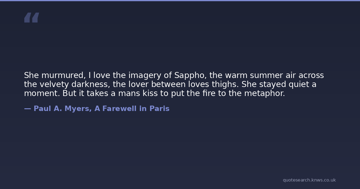 She murmured, I love the imagery of Sappho, the warm summer air across the velvety darkness, the lover between loves thighs. She stayed quiet a moment. But it takes a mans kiss to put the fire to the metaphor.