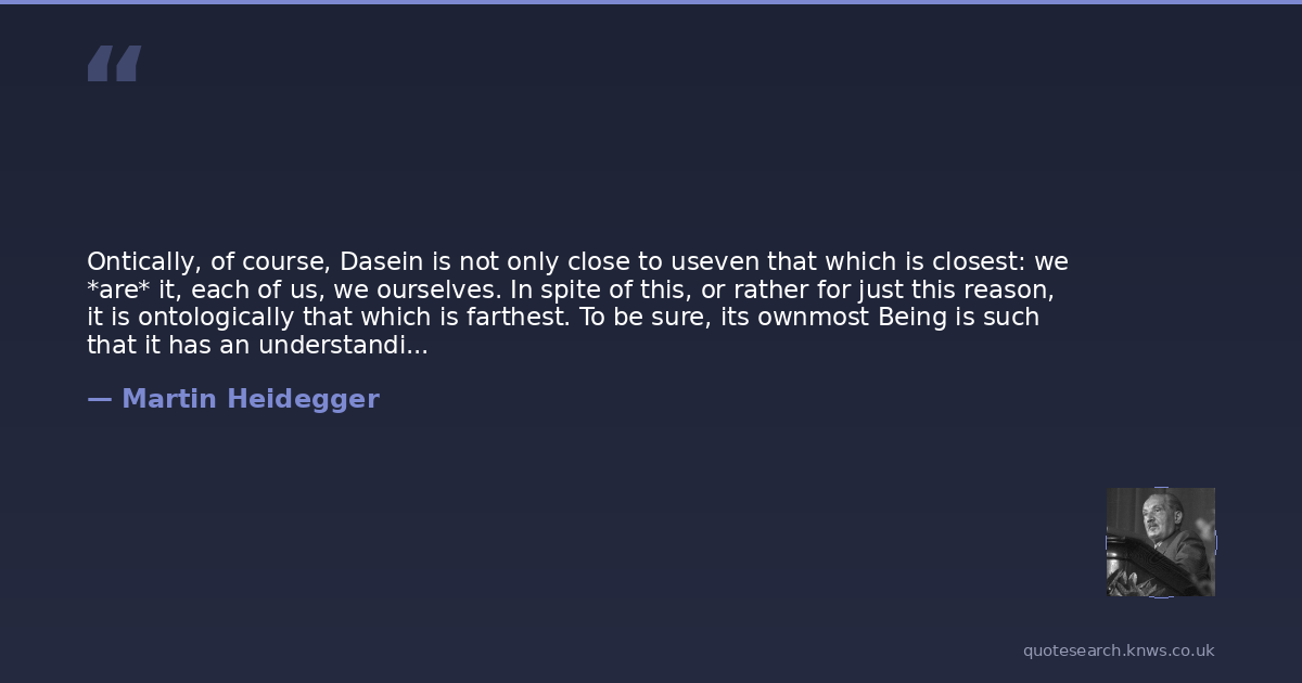 Ontically, of course, Dasein is not only close to useven that which is closest: we *are* it, each of us, we ourselves. In spite of this, or rather for just this reason, it is ontologically that which is farthest. To be sure, its ownmost Being is such that it has an understanding of that Being, and already maintains itself in each case as if its Being has been interpreted in some manner. But we are certainly not saying that when Dasein's own Being is thus interpreted pre-ontologically in the way which lies closest, this interpretation can be taken over as an appropriate clue, as if this way of understanding Being is what must emerge when one's ownmost state of Being is considered as an ontological theme. The kind of Being which belongs to Dasein is rather such that, in understanding its own Being, it has a tendency to do so in terms of that entity towards which it comports itself proximally and in a way which is essentially constantin terms of the 'world'. In Dasein itself, and therefore in its own understanding of Being, the way the world is understood is, as we shall show, reflected back ontologically upon the way in which Dasein itself gets interpreted.Thus because Dasein is ontico-ontologically prior, its own specific state of Being (if we understand this in the sense of Dasein's 'categorial structure') remains concealed from it. Dasein is ontically 'closest' to itself and ontologically farthest; but pre-ontologically it is surely not a stranger."from_Being and Time_. Translated by John Macquarrie & Edward Robinson, pp. 36-37