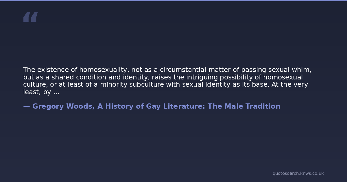 The existence of homosexuality, not as a circumstantial matter of passing sexual whim, but as a shared condition and identity, raises the intriguing possibility of homosexual culture, or at least of a minority subculture with sexual identity as its base. At the very least, by sympathetic identification with cultural texts which appeared to be affirmative, homosexual people saw a way to shore up their self-respect in the face of constant moral attack, and they found materials with which to justify themselves not only to each other but also to those who found their very existence, let alone their behaviour, unjustifiable.