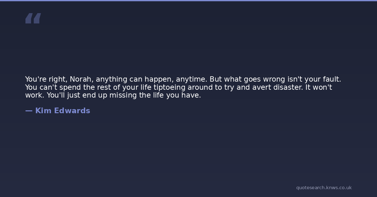 You're right, Norah, anything can happen, anytime. But what goes wrong isn't your fault. You can't spend the rest of your life tiptoeing around to try and avert disaster. It won't work. You'll just end up missing the life you have.