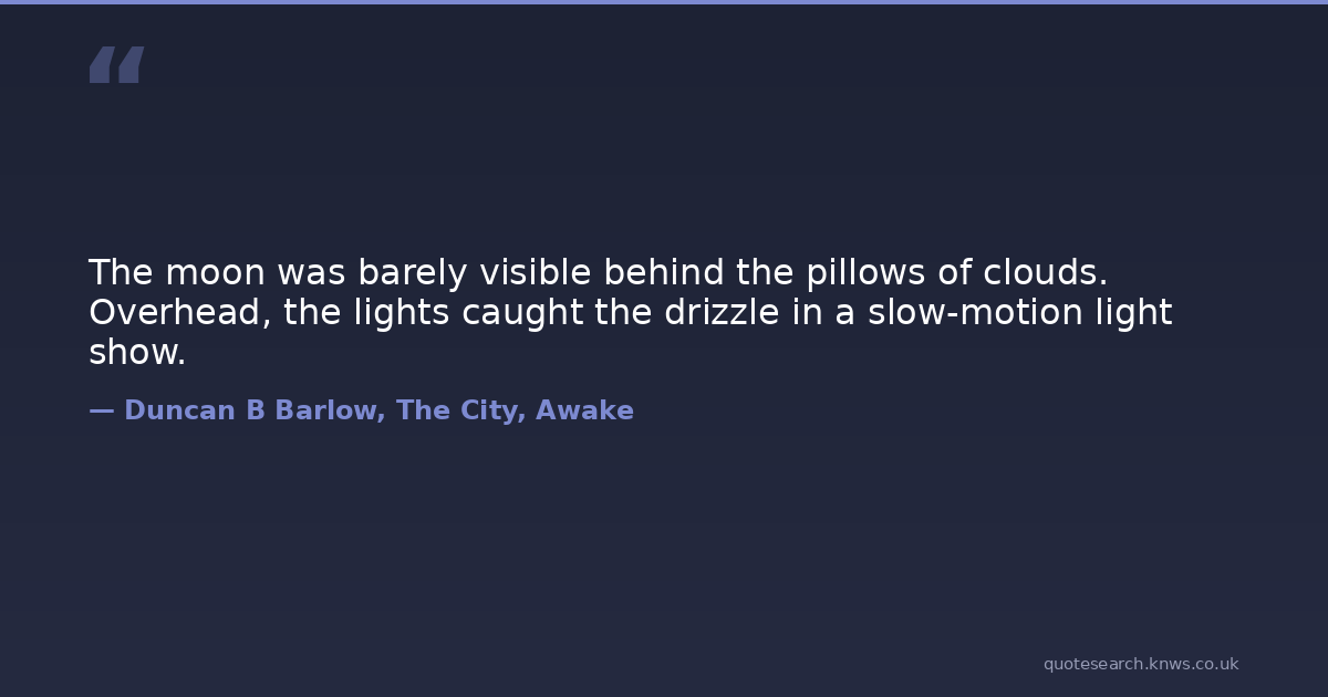 The moon was barely visible behind the pillows of clouds. Overhead, the lights caught the drizzle in a slow-motion light show.