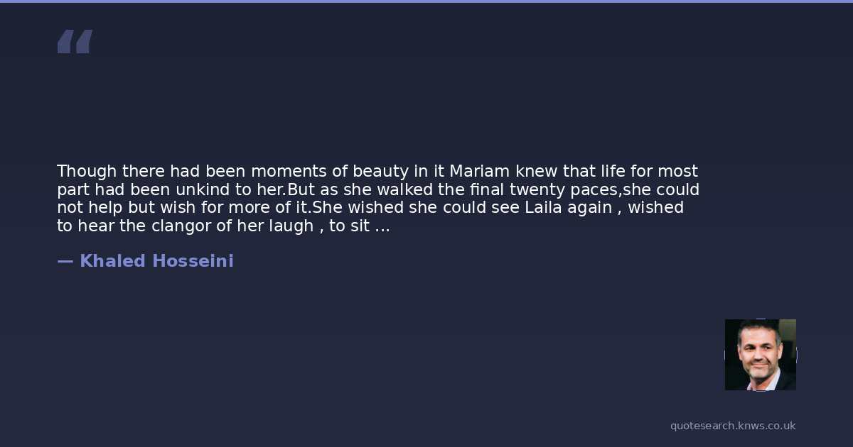 Though there had been moments of beauty in it Mariam knew that life for most part had been unkind to her.But as she walked the final twenty paces,she could not help but wish for more of it.She wished she could see Laila again , wished to hear the clangor of her laugh , to sit with her once more for a pot of chai and leftover halwa under a starlit sky. She mourned that she would never see Aziza grow up , would not see the beautiful young woman that she would oneday become ,would not get to paint her hands with henna and toss noqul candy at her wedding . She would never play with Aziza's children. She would have liked that very much , to be old and play with Aziza's children.Mariam wished for so much in those final moments. Yet as she closed her eyes , it was not regret any longer but a sensation of abundant peace that wshed over her. She thought of her entry into this world , the harami child of a lowly villager , an unintended thing , a pitiable , regrettable accident. A weed , And yet she was leaving the wolrd as a woman who had loved and been loved back.She was leaving it as a friend , a companion , a guardian.A mother. A person of consequence at last. No. It was no so bad , Mariam thought , that she should die this way. Not so bad.This was a legitimate end to a life of illegitimate beginnings. pg. 360