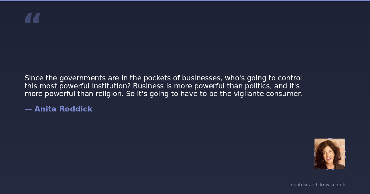 Since the governments are in the pockets of businesses, who's going to control this most powerful institution? Business is more powerful than politics, and it's more powerful than religion. So it's going to have to be the vigilante consumer.