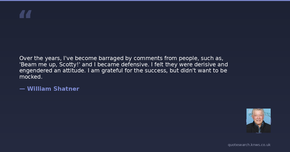 Over the years, I've become barraged by comments from people, such as, 'Beam me up, Scotty!' and I became defensive. I felt they were derisive and engendered an attitude. I am grateful for the success, but didn't want to be mocked.