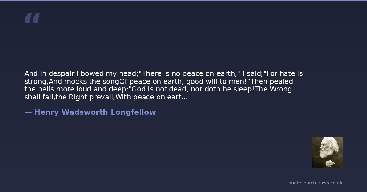 And in despair I bowed my head;"There is no peace on earth," I said;"For hate is strong,And mocks the songOf peace on earth, good-will to men!"Then pealed the bells more loud and deep:"God is not dead, nor doth he sleep!The Wrong shall fail,the Right prevail,With peace on earth, good-will to men!