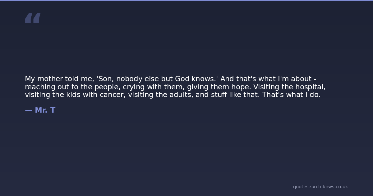 My mother told me, 'Son, nobody else but God knows.' And that's what I'm about - reaching out to the people, crying with them, giving them hope. Visiting the hospital, visiting the kids with cancer, visiting the adults, and stuff like that. That's what I do.