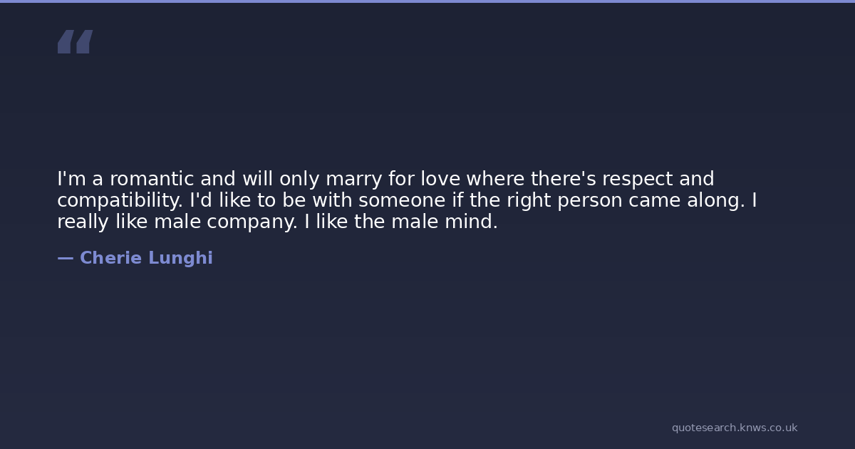 I'm a romantic and will only marry for love where there's respect and compatibility. I'd like to be with someone if the right person came along. I really like male company. I like the male mind.