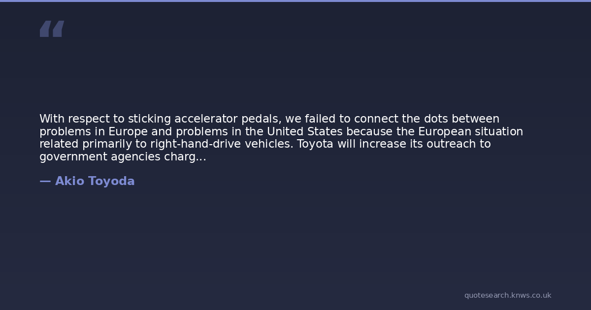 With respect to sticking accelerator pedals, we failed to connect the dots between problems in Europe and problems in the United States because the European situation related primarily to right-hand-drive vehicles. Toyota will increase its outreach to government agencies charged with protecting the safety of motorists and passengers.