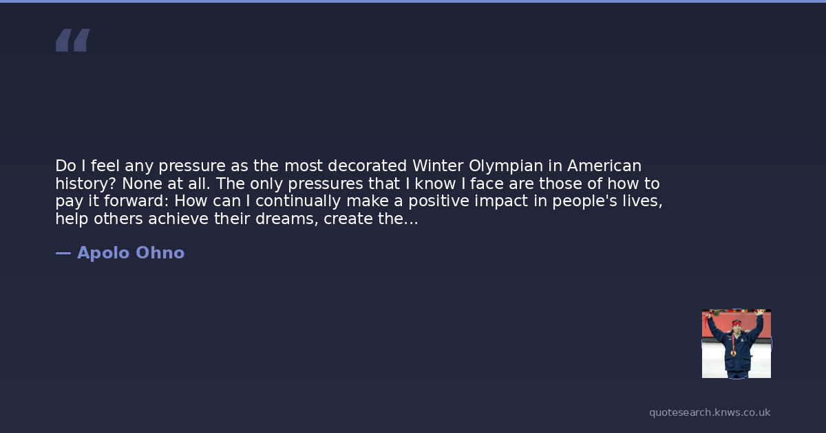 Do I feel any pressure as the most decorated Winter Olympian in American history? None at all. The only pressures that I know I face are those of how to pay it forward: How can I continually make a positive impact in people's lives, help others achieve their dreams, create their own Olympic mindset, creating champions within themselves?