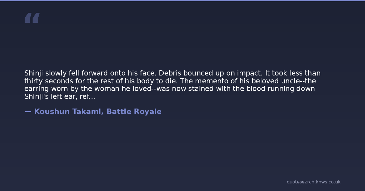 Shinji slowly fell forward onto his face. Debris bounced up on impact. It took less than thirty seconds for the rest of his body to die. The memento of his beloved uncle--the earring worn by the woman he loved--was now stained with the blood running down Shinji's left ear, reflecting the glow from the red flames of the farm building.And so the boy known as the Third Man, Shinji Mimura, was dead.
