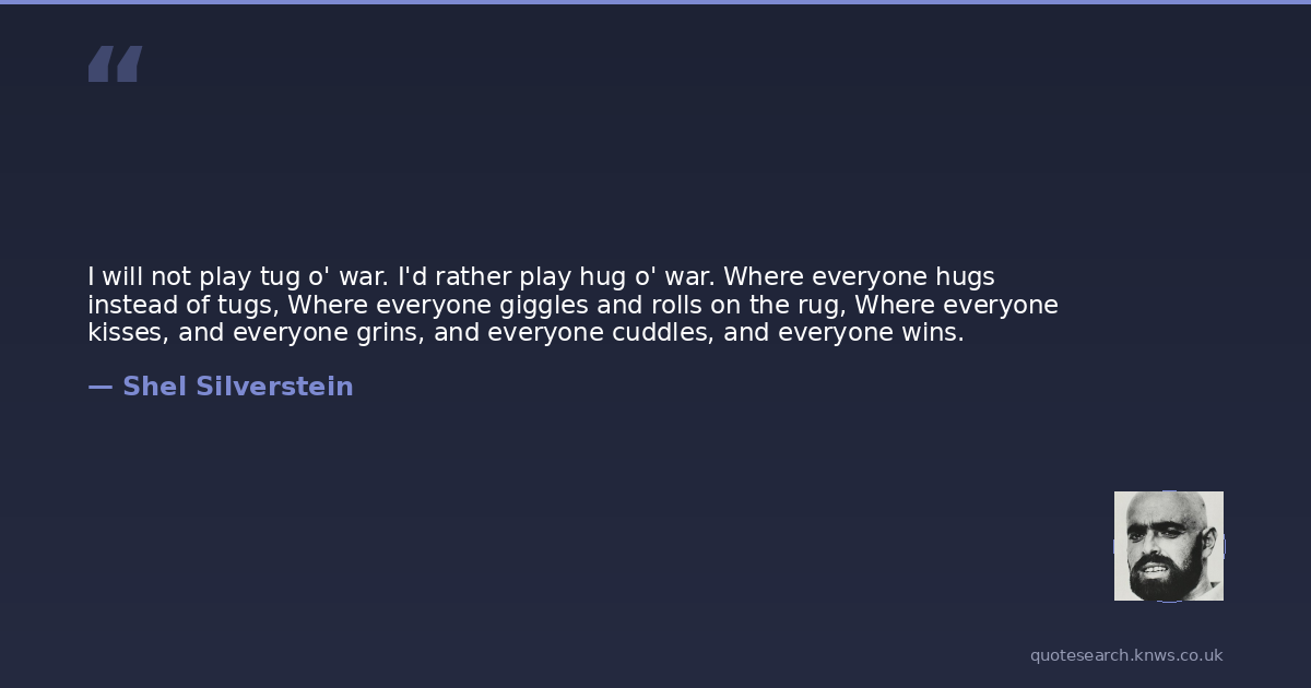 I will not play tug o' war. I'd rather play hug o' war. Where everyone hugs instead of tugs, Where everyone giggles and rolls on the rug, Where everyone kisses, and everyone grins, and everyone cuddles, and everyone wins.