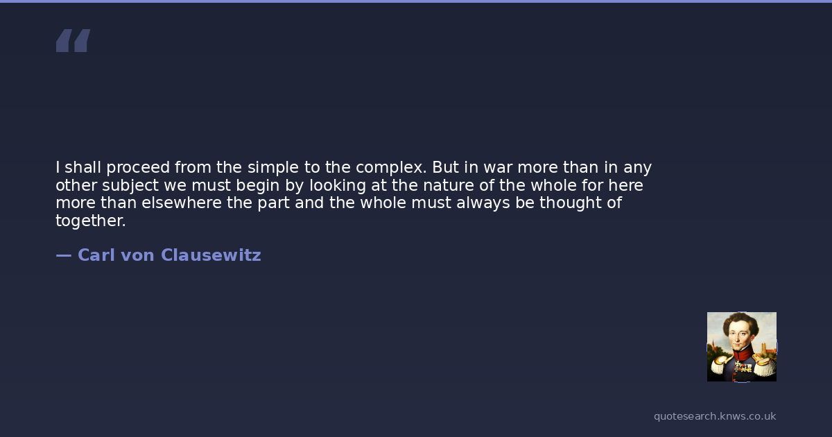 I shall proceed from the simple to the complex. But in war more than in any other subject we must begin by looking at the nature of the whole for here more than elsewhere the part and the whole must always be thought of together.