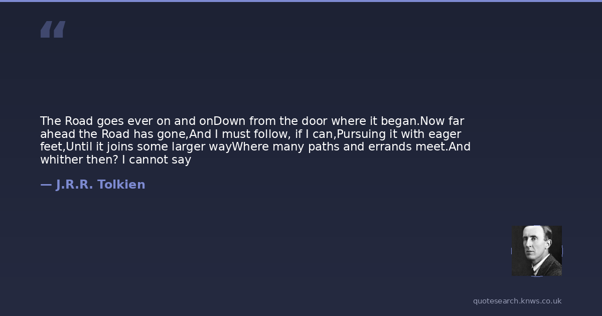 The Road goes ever on and onDown from the door where it began.Now far ahead the Road has gone,And I must follow, if I can,Pursuing it with eager feet,Until it joins some larger wayWhere many paths and errands meet.And whither then? I cannot say