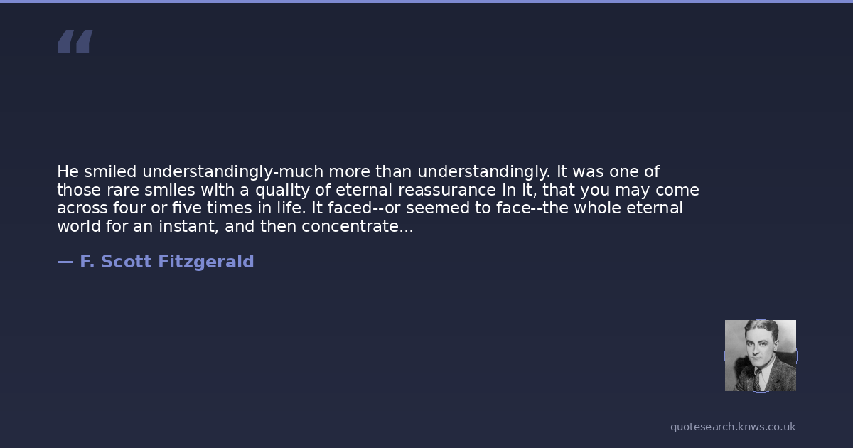 He smiled understandingly-much more than understandingly. It was one of those rare smiles with a quality of eternal reassurance in it, that you may come across four or five times in life. It faced--or seemed to face--the whole eternal world for an instant, and then concentrated on you with an irresistible prejudice in your favor. It understood you just as far as you wanted to be understood, believed in you as you would like to believe in yourself, and assured you that it had precisely the impression of you that, at your best, you hoped to convey.