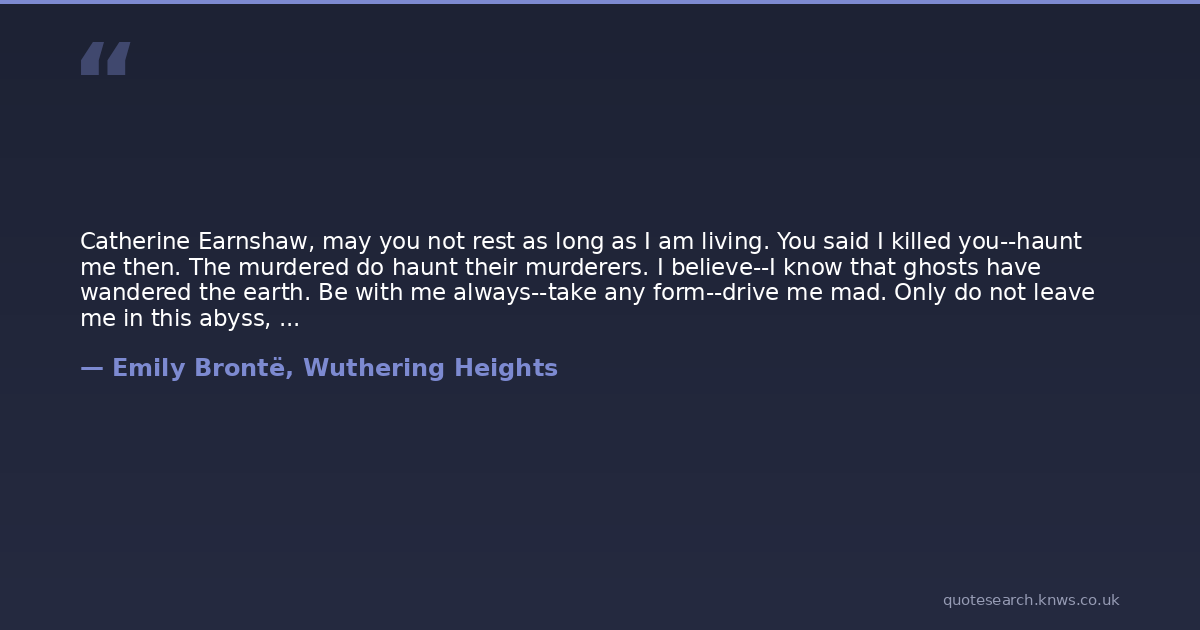 Catherine Earnshaw, may you not rest as long as I am living. You said I killed you--haunt me then. The murdered do haunt their murderers. I believe--I know that ghosts have wandered the earth. Be with me always--take any form--drive me mad. Only do not leave me in this abyss, where I cannot find you! Oh, God! It is unutterable! I cannot live without my life! I cannot live without my soul!