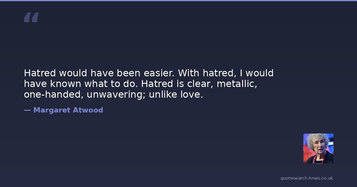 Hatred would have been easier. With hatred, I would have known what to do. Hatred is clear, metallic, one-handed, unwavering; unlike love.