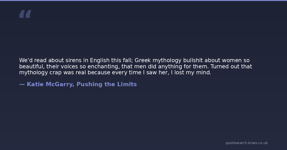 We’d read about sirens in English this fall; Greek mythology bullshit about women so beautiful, their voices so enchanting, that men did anything for them. Turned out that mythology crap was real because every time I saw her, I lost my mind.