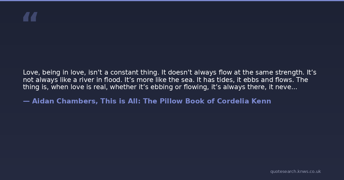 Love, being in love, isn’t a constant thing. It doesn’t always flow at the same strength. It’s not always like a river in flood. It’s more like the sea. It has tides, it ebbs and flows. The thing is, when love is real, whether it’s ebbing or flowing, it’s always there, it never goes away. And that’s the only proof you can have that it is real, and not just a crush or an infatuation or a passing fancy