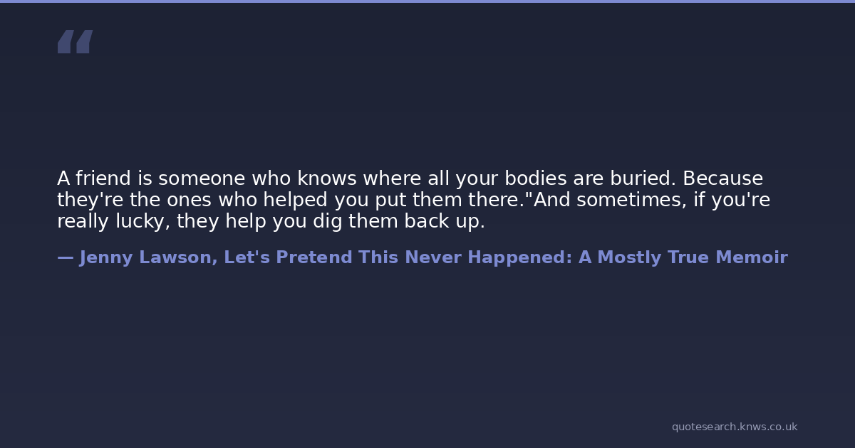 A friend is someone who knows where all your bodies are buried. Because they're the ones who helped you put them there."And sometimes, if you're really lucky, they help you dig them back up.