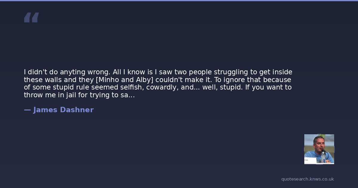 I didn't do anyting wrong. All I know is I saw two people struggling to get inside these walls and they [Minho and Alby] couldn't make it. To ignore that because of some stupid rule seemed selfish, cowardly, and... well, stupid. If you want to throw me in jail for trying to save someone's [Alby] life, then go ahead. Next time I promise I'll point at them and laugh, then go eat some of Frypan's dinner. -Thomas